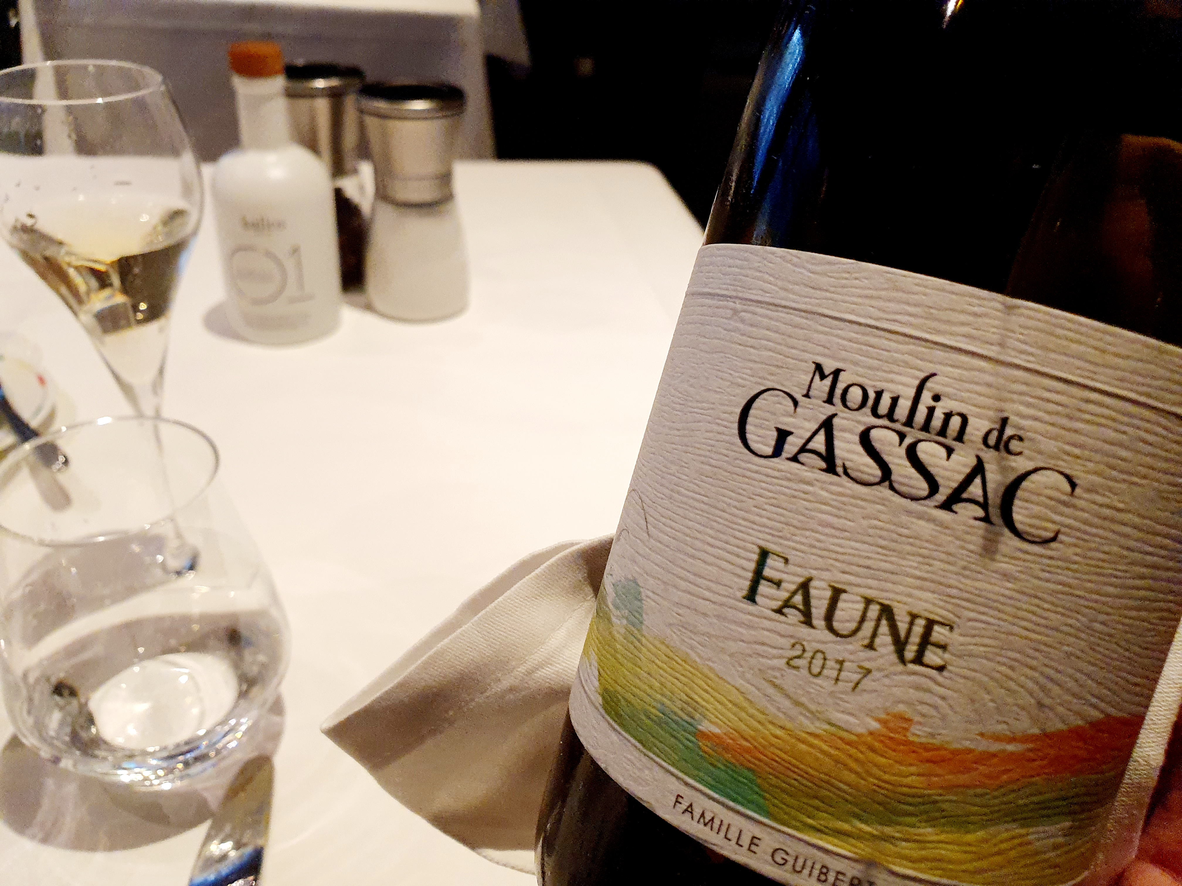 The accorded white wine; a Faune, Moulin de Gassac 2017, Vin de Pays d’Hérault was fresh and fruity. Perfect for the fish.