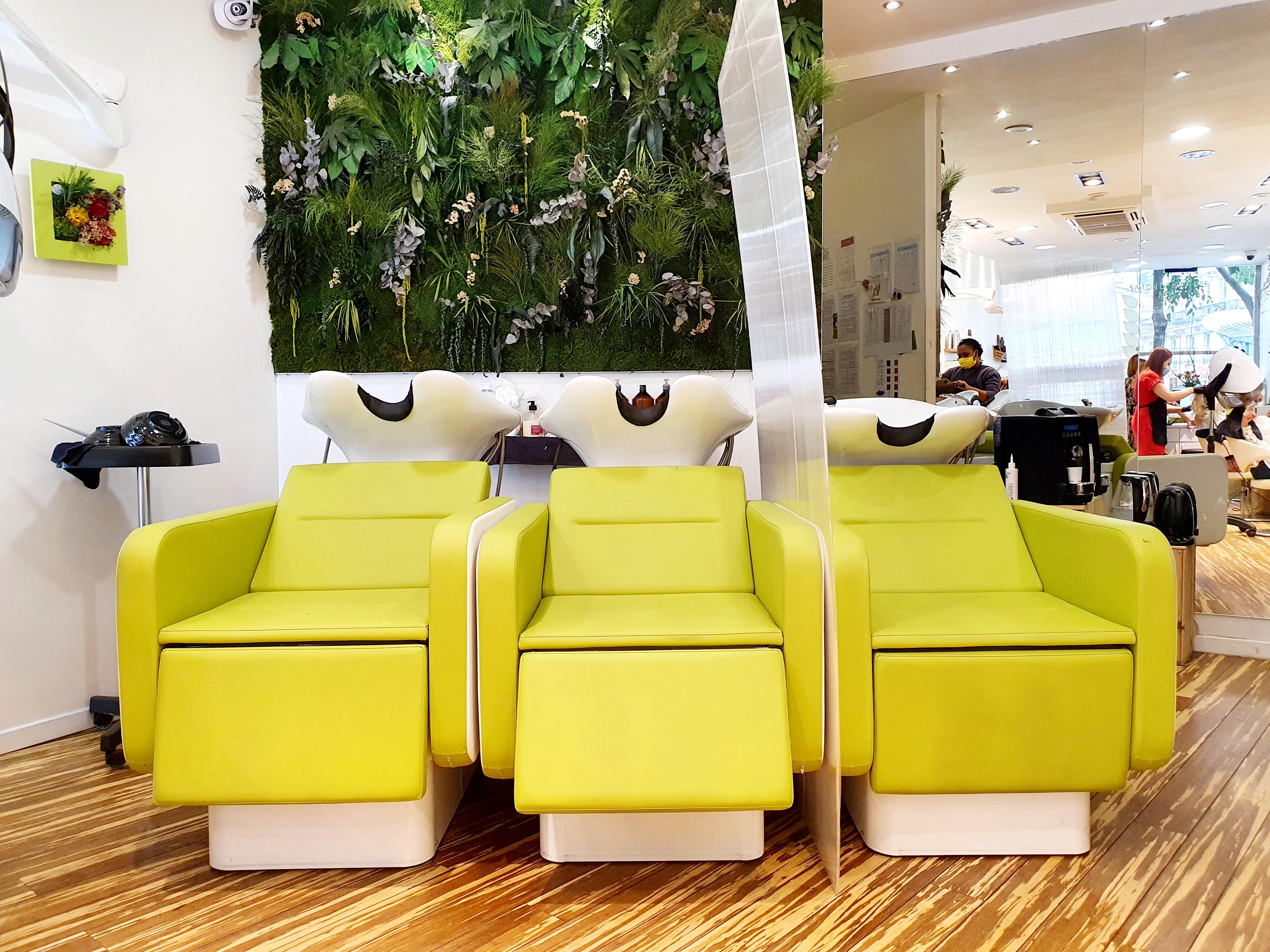Inside you’ll find a beautiful modern green color and a decoration with the best of nature …in perfect coherence with the concept of the salon and their natural bio products.