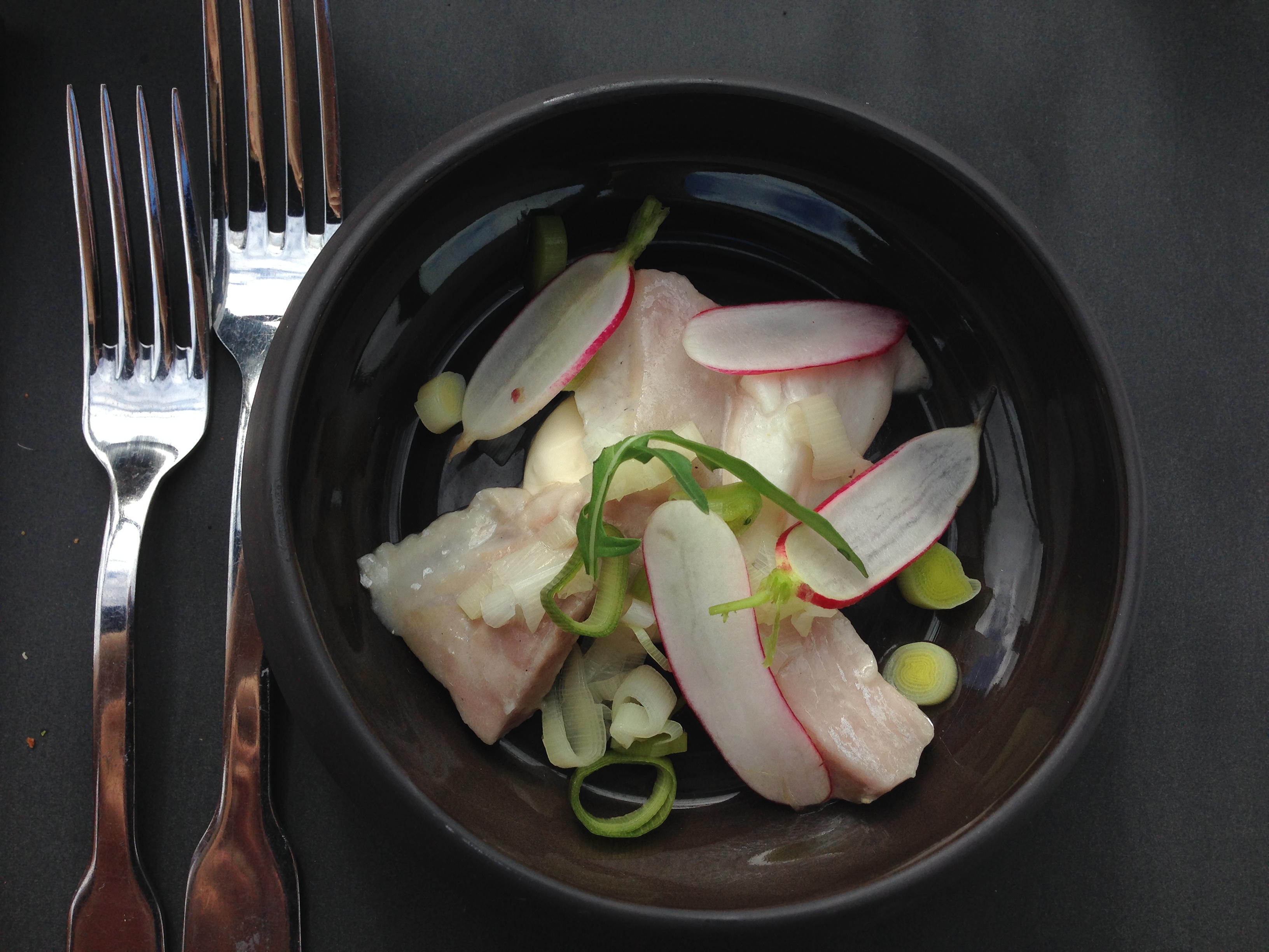 A Sea bream ceviche, marinated in yuzu, leak and radish was created by Yoni Saada. A great combination of fish and fresh vegetables.