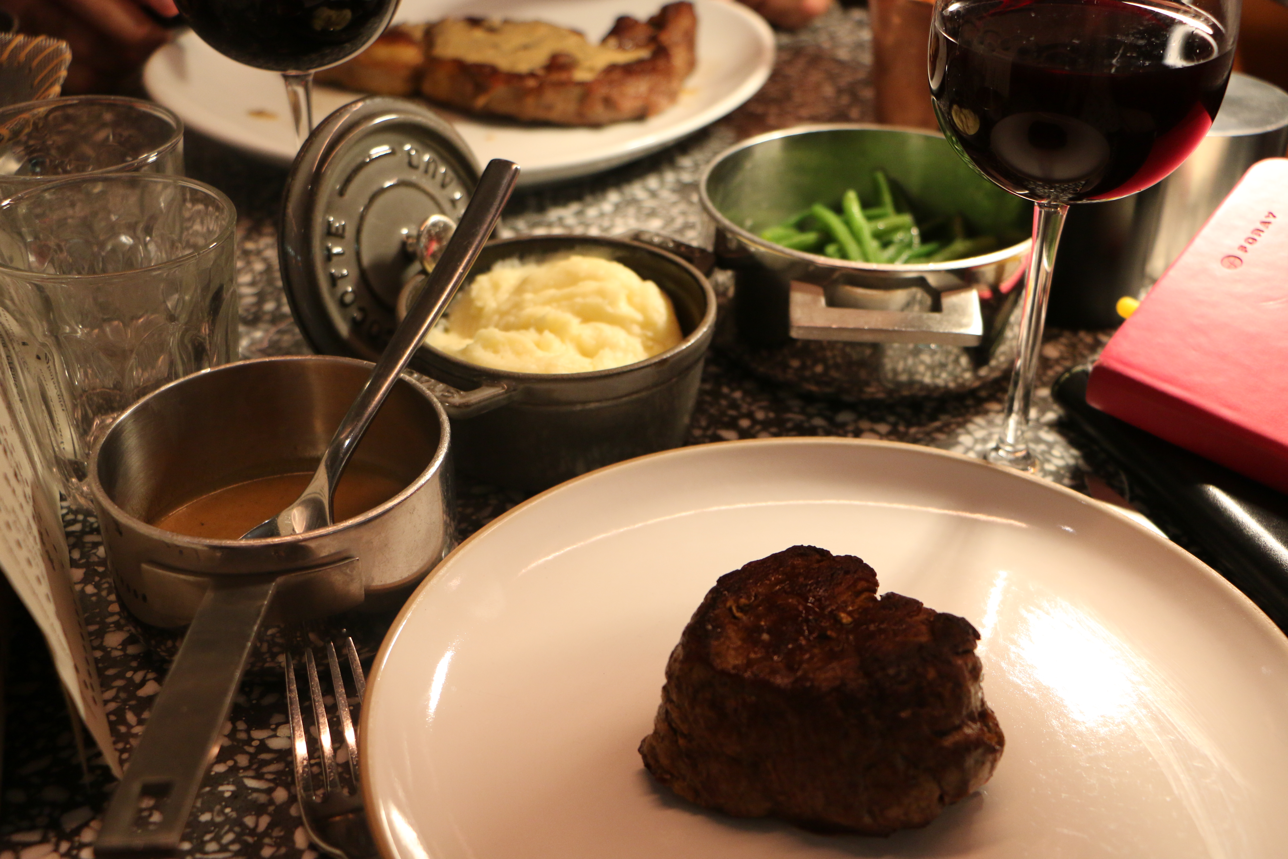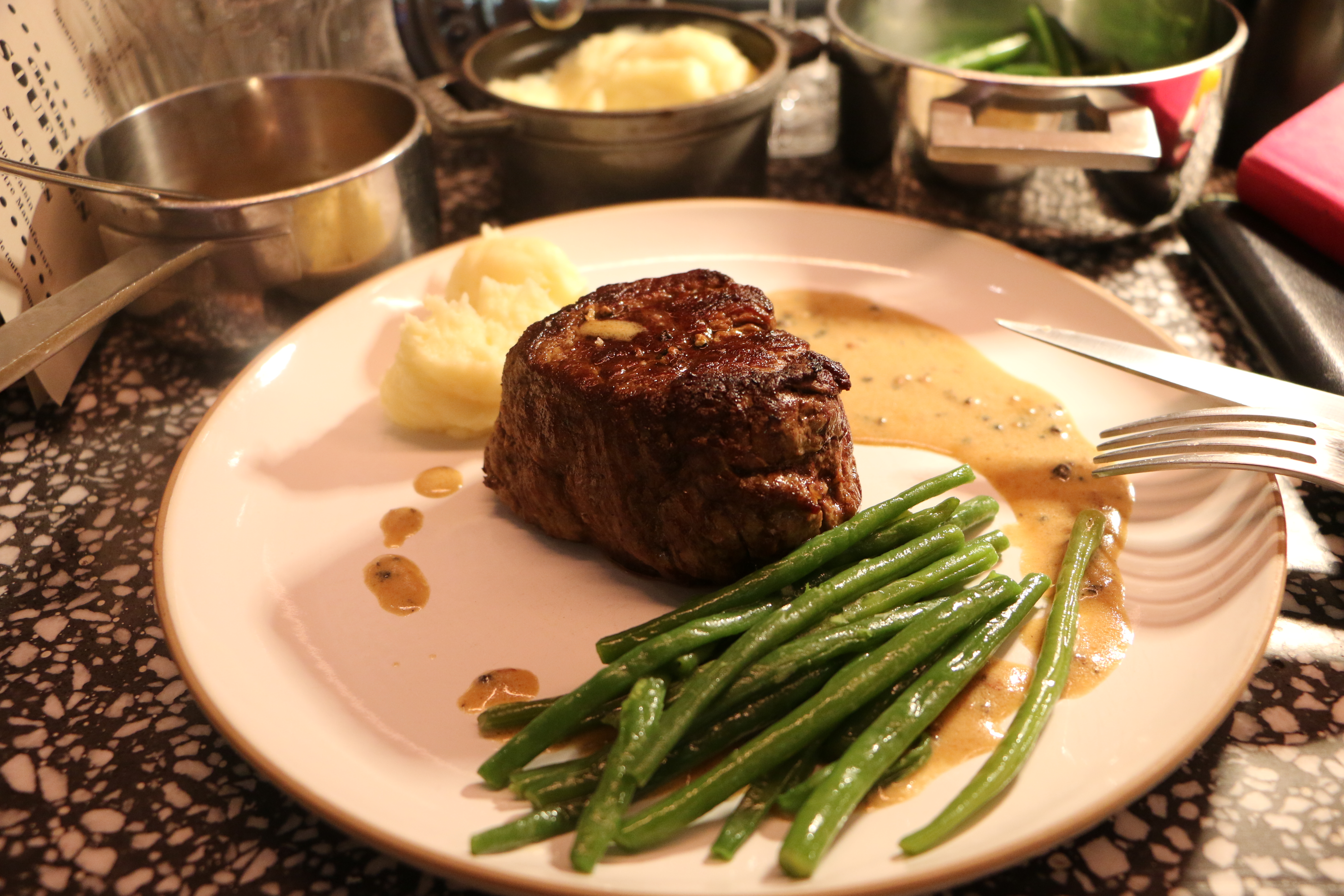 Until the next stop at the soft and tasty ´Filet with mashed potatoes, green beans and pepper sauce´. A well selected piece of the best meat you can get.. perfectly accorded with the red-wine: ´La reserve de Louis Saint Emilion Grand Cru´…a round, strong and harmonious red-wine that was making my tastebuds very happy…