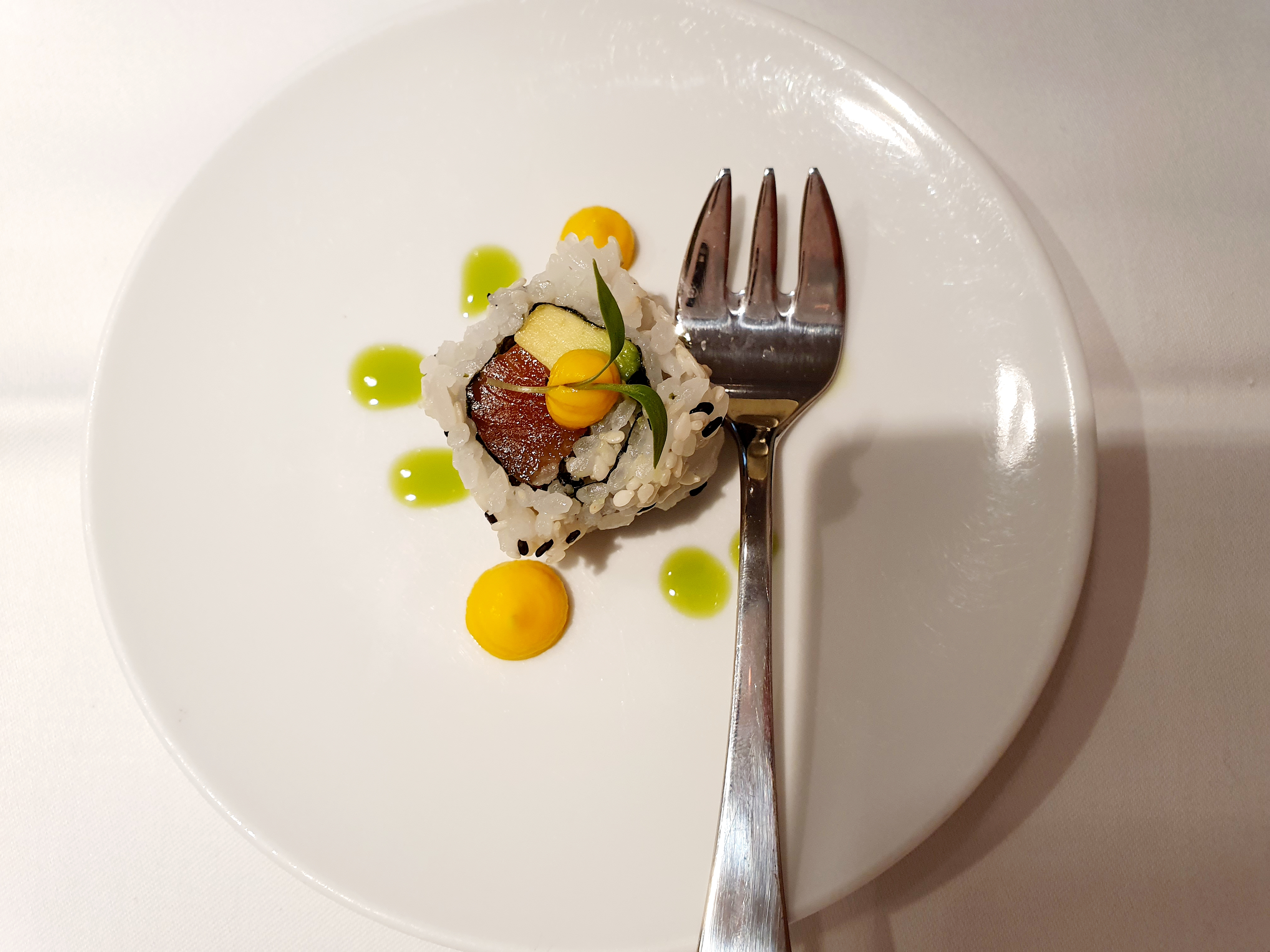 As an amouse bouche, a maki with carrot and ginger sauce was served. Delicious.
