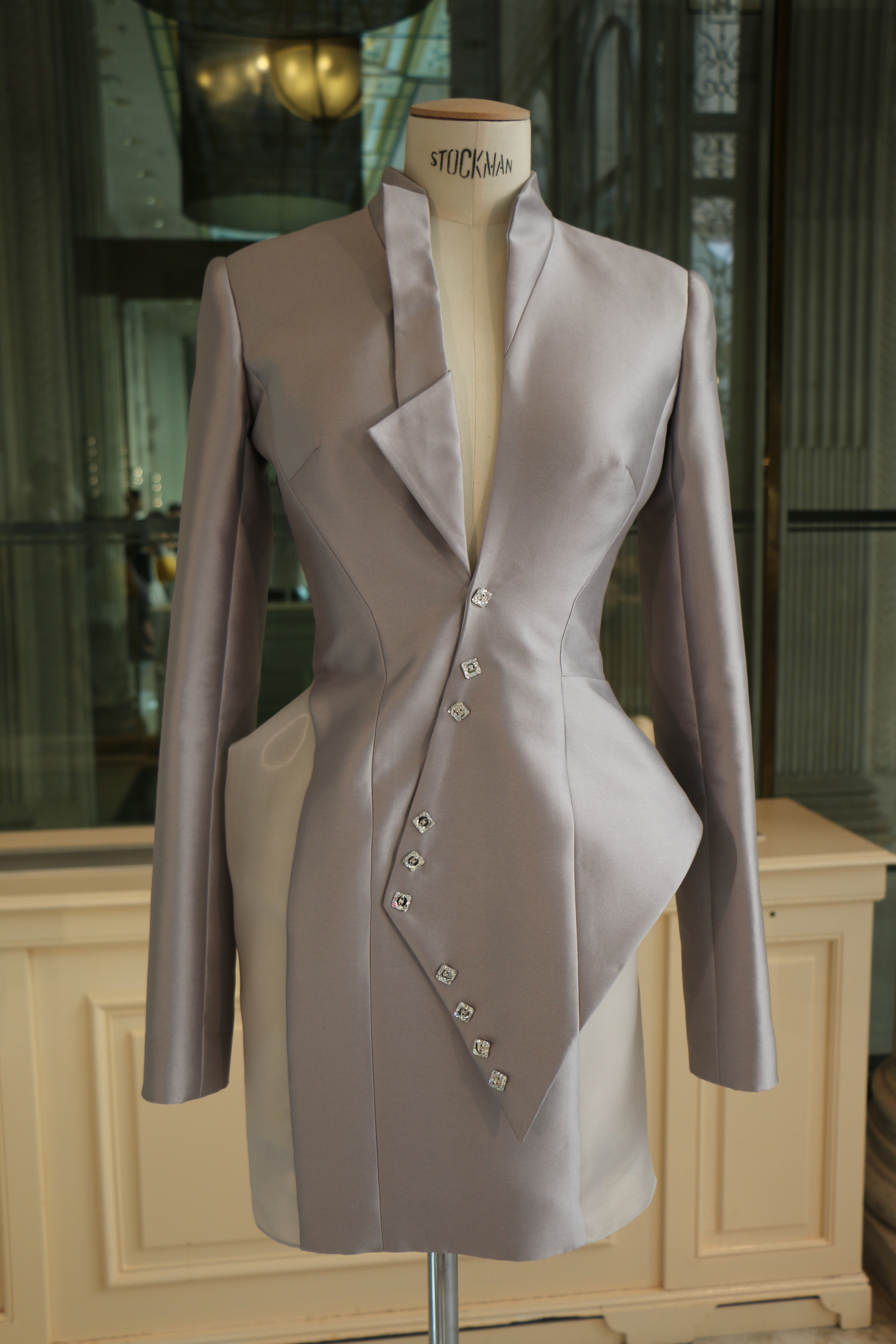 Below you see the moulages silver metallic jacquard midi dress with asymmetric voluminous shoulder. Very impressive…