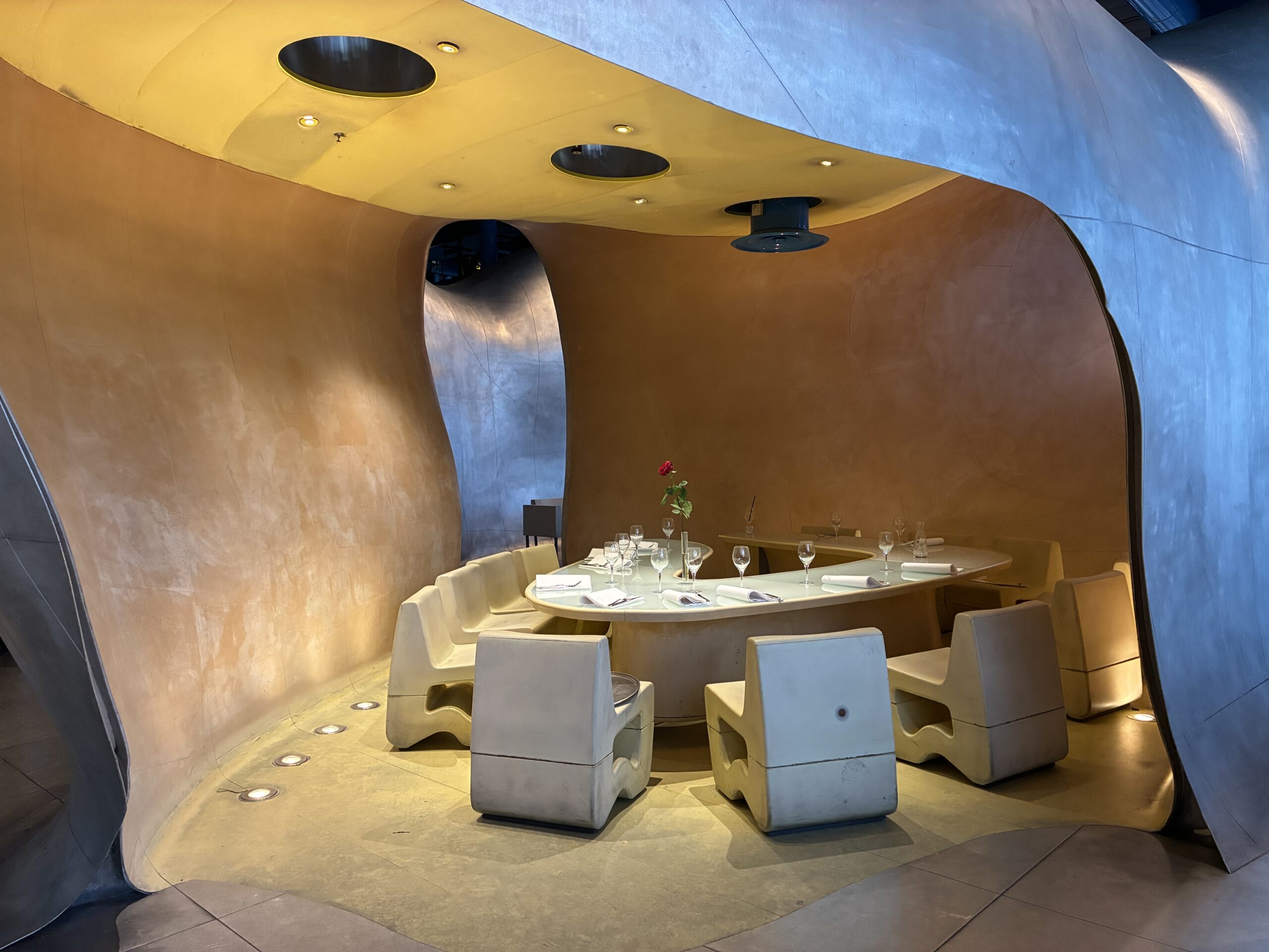 The ambiance is ultra-modern and chic, with a silver pod-like interiors and floor-to-ceiling windows.