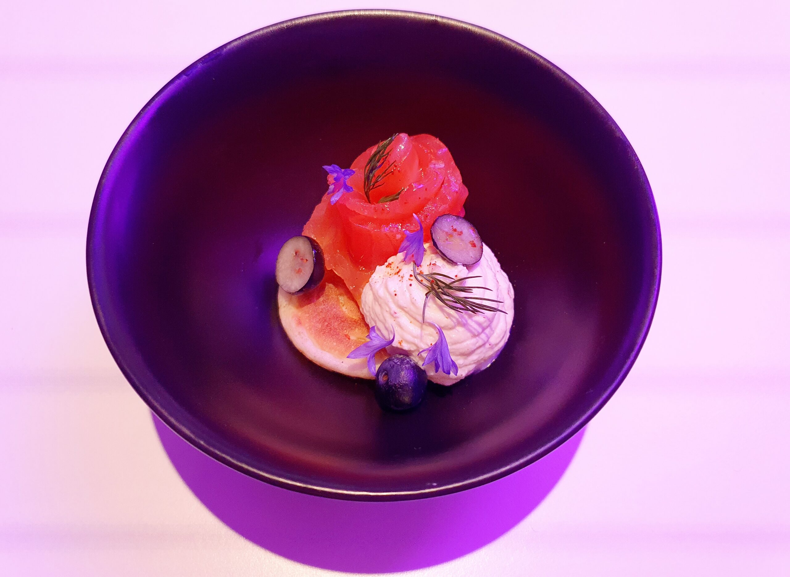 I continued with a red label salmon in gravlax on housemade blinis with blueberries and Ewe’s claw. Really delicious as well.