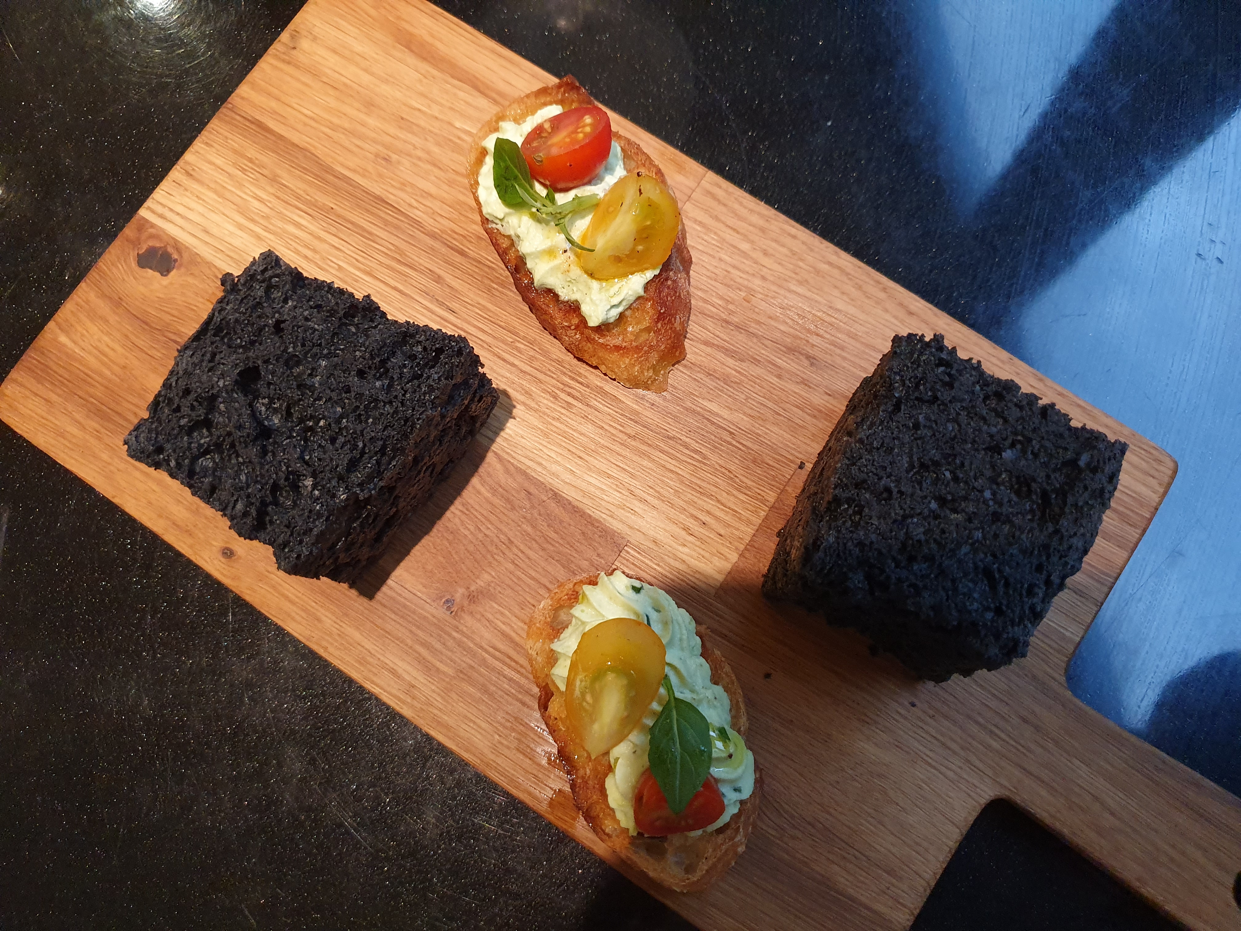 It started with an Amuse bouche: bruschetta with tomatoes, ricotta with herbs and bread with charcoal … surprisingly good.