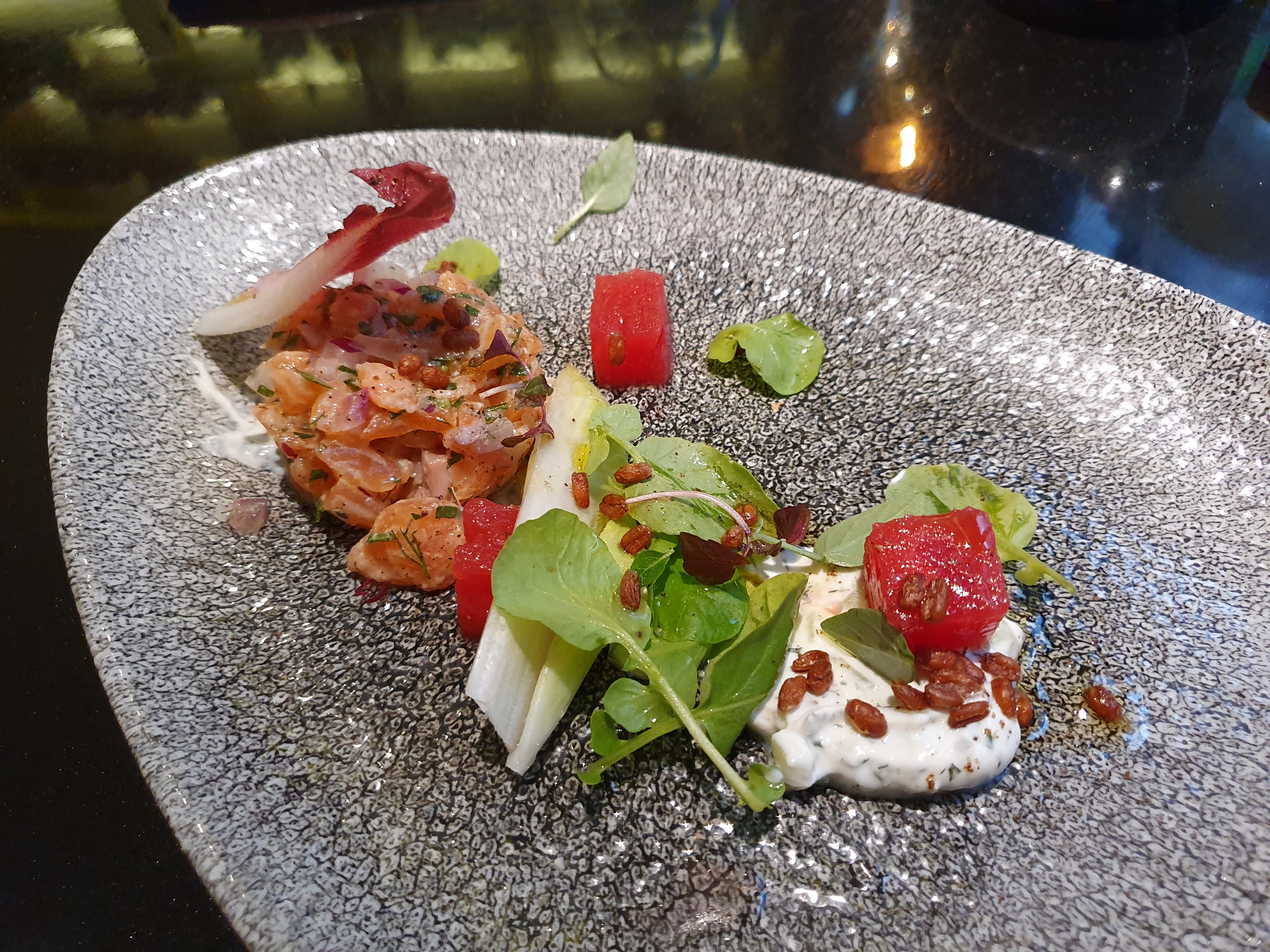 Then a marinated salmon with cream dill and waltermelon was served.