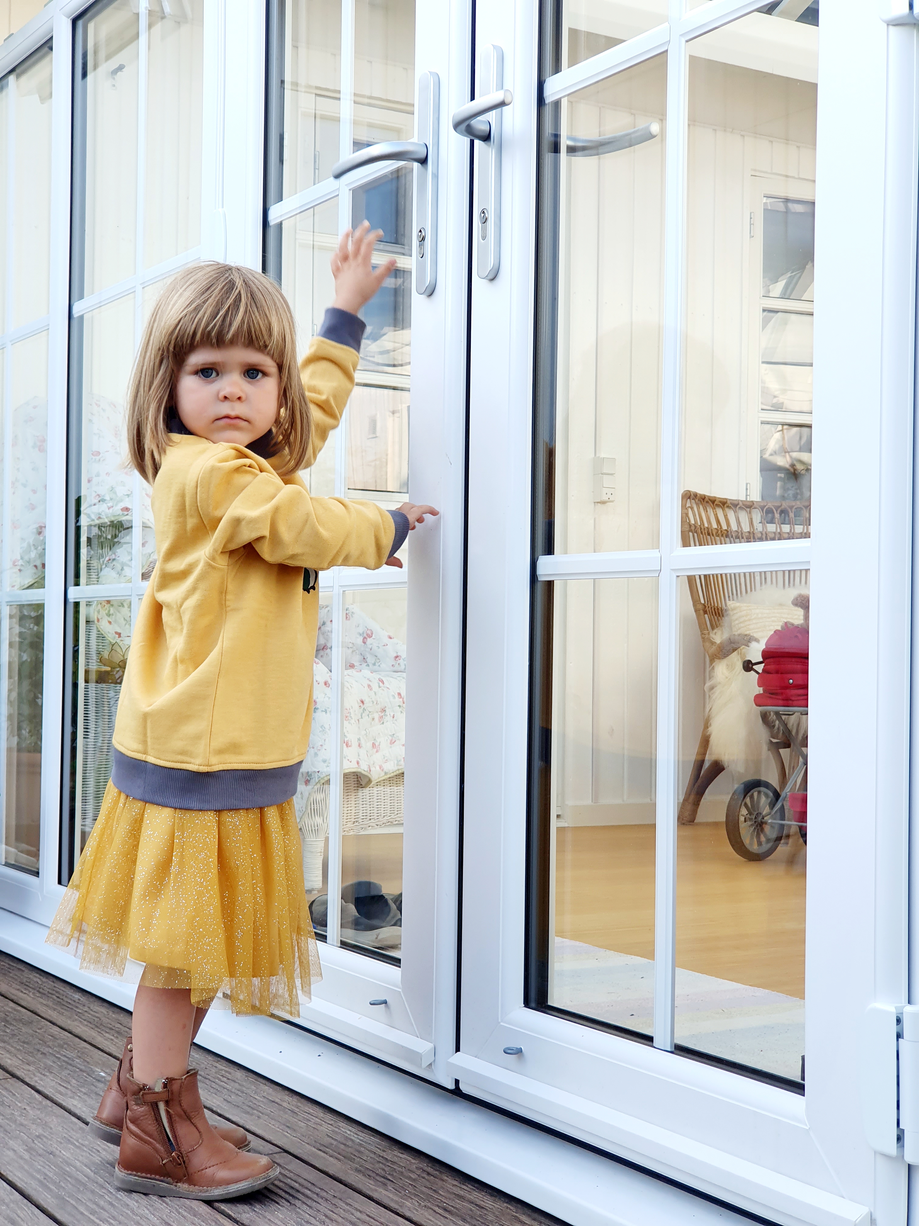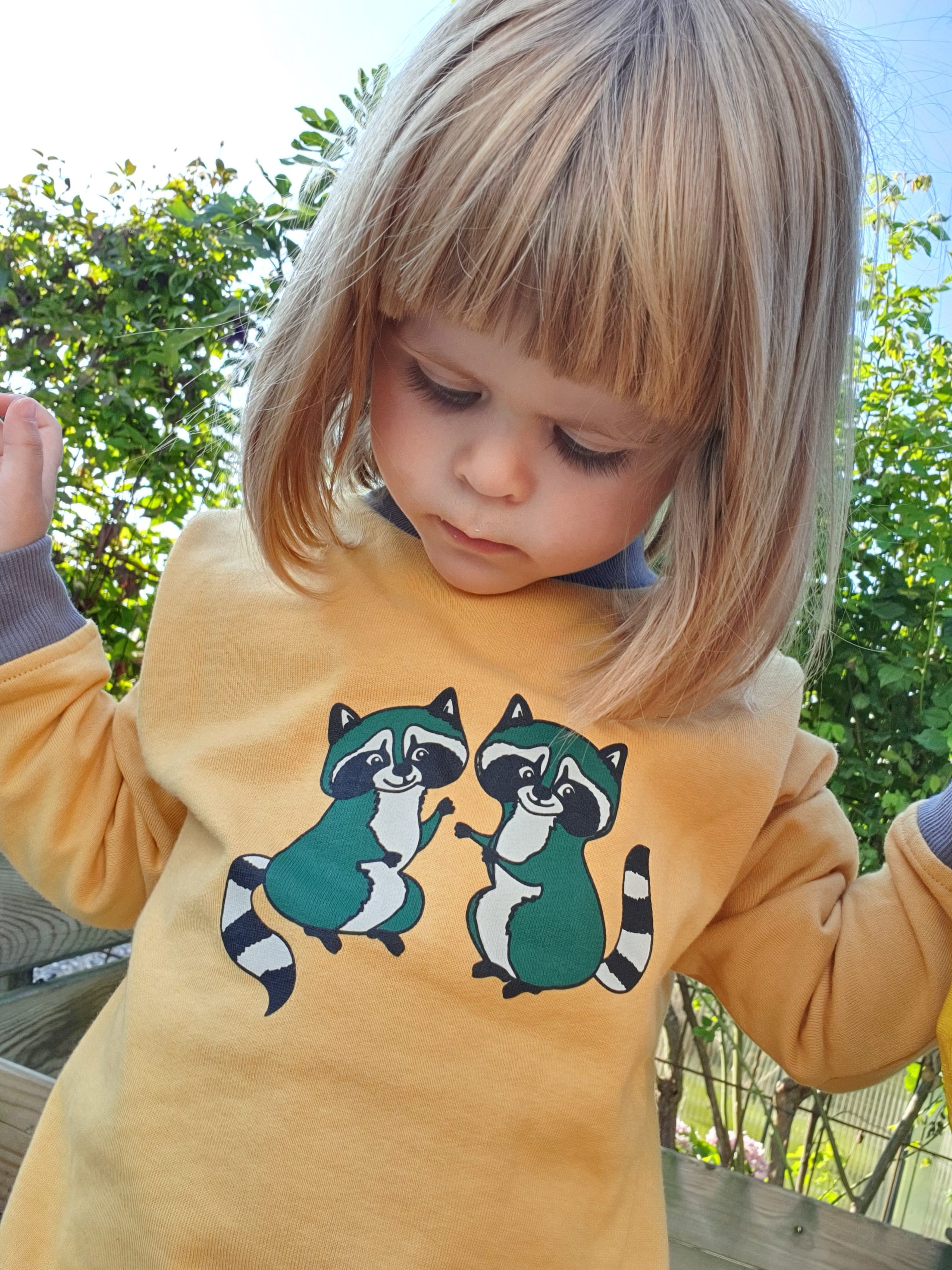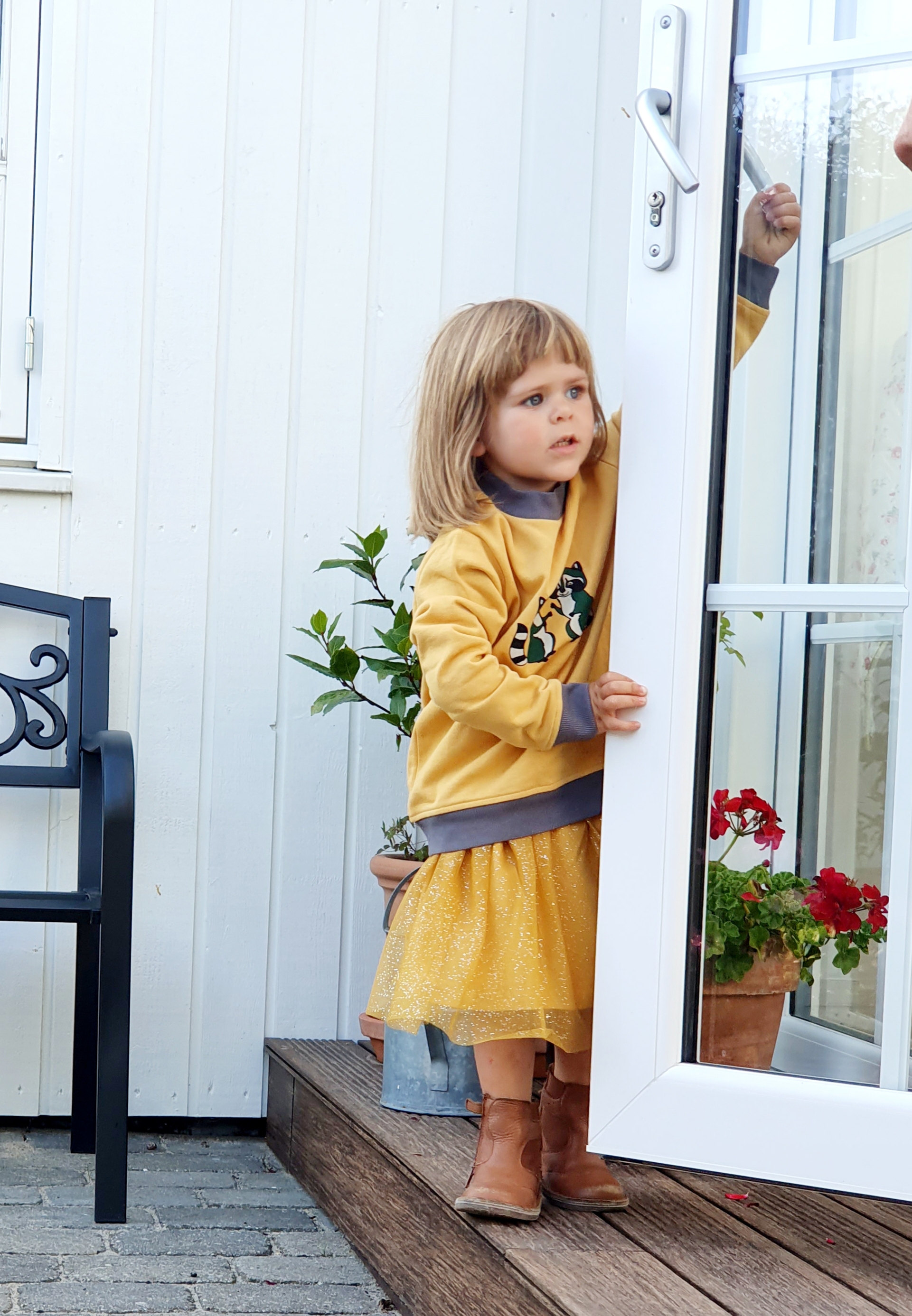 I also melted over the warm sweatshirt with raccon. It is made of 100% organic cotton and I think it is super cute with the little yellow shirt with tulle skirt and glitter elastic waist.