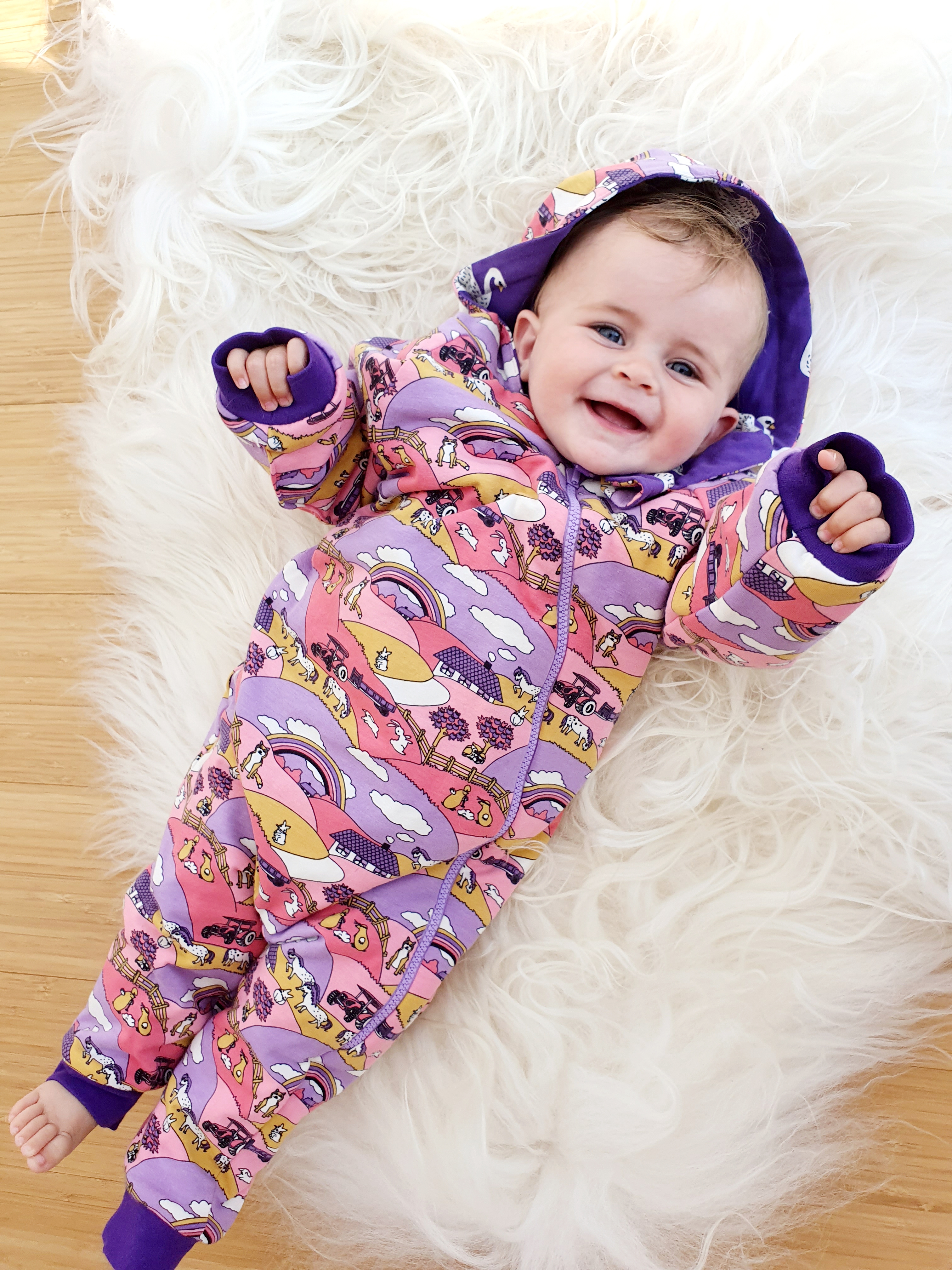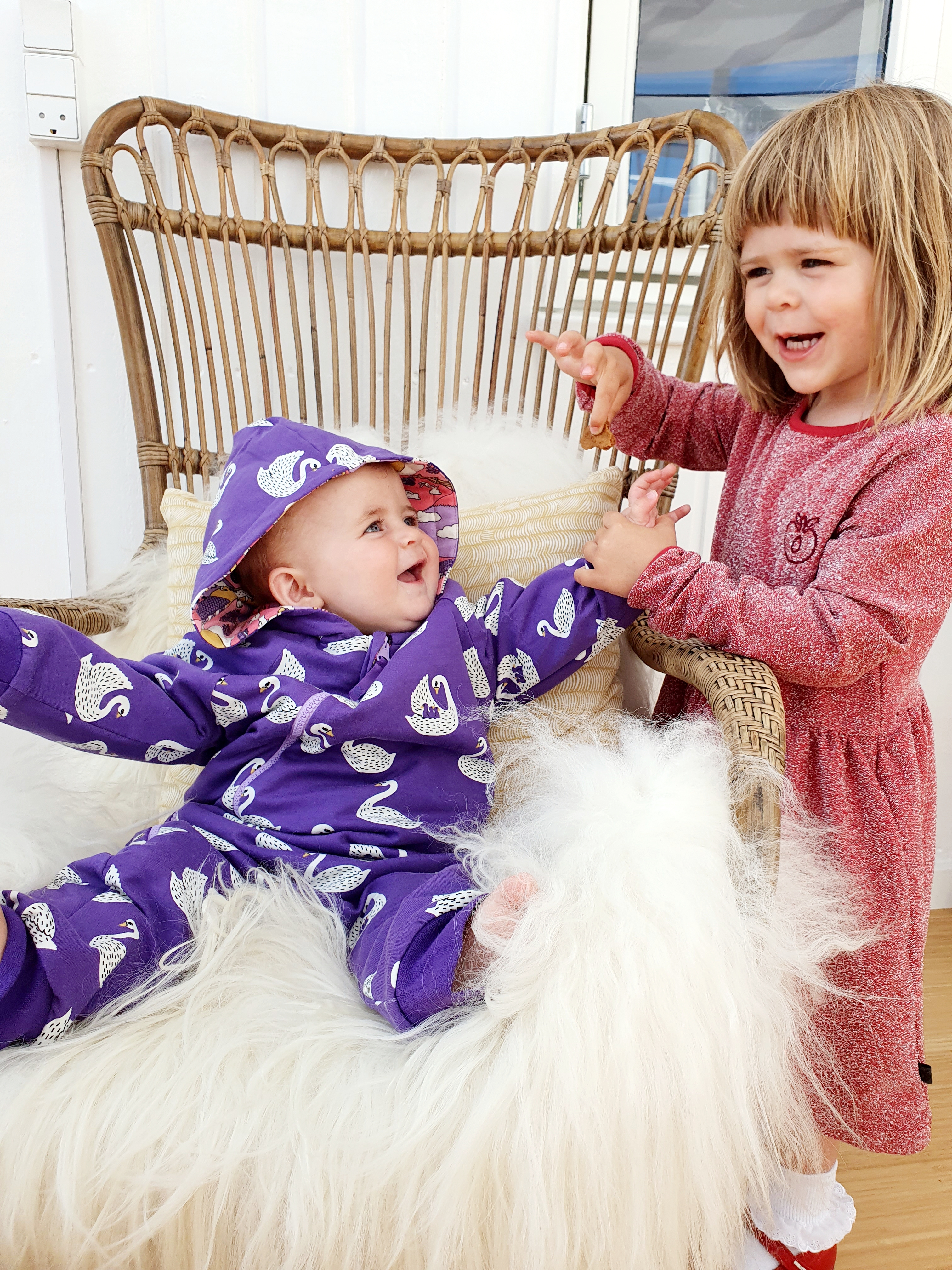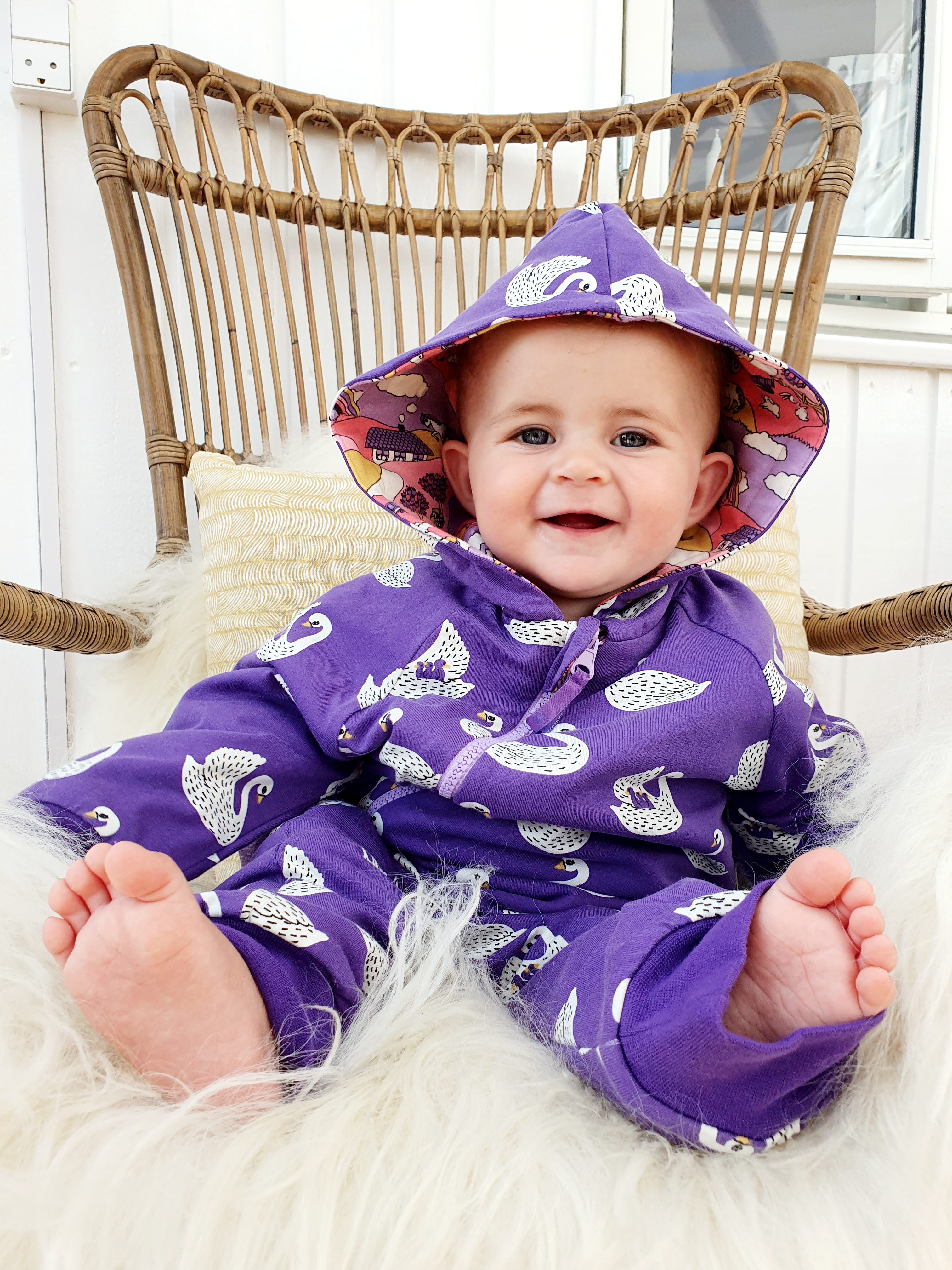 My 7 months old girl loves the turnable suit with hood. It is amazing for winter, really! The suit has landscape print on one side and swan print on the other. It has a smooth polyester padding and rib by the wrist and foot, and is made of 95% organic cotton and 5% elasthan.