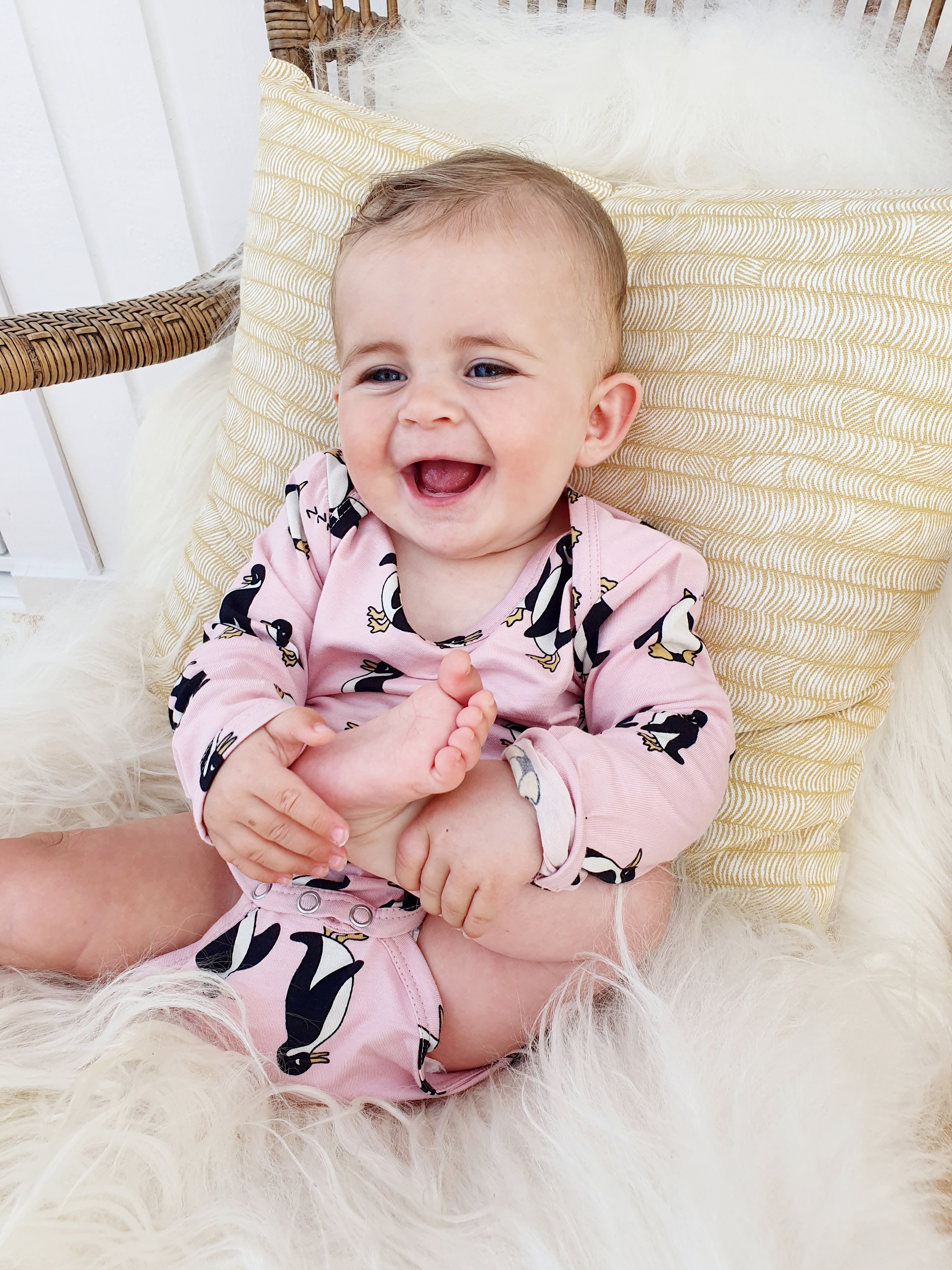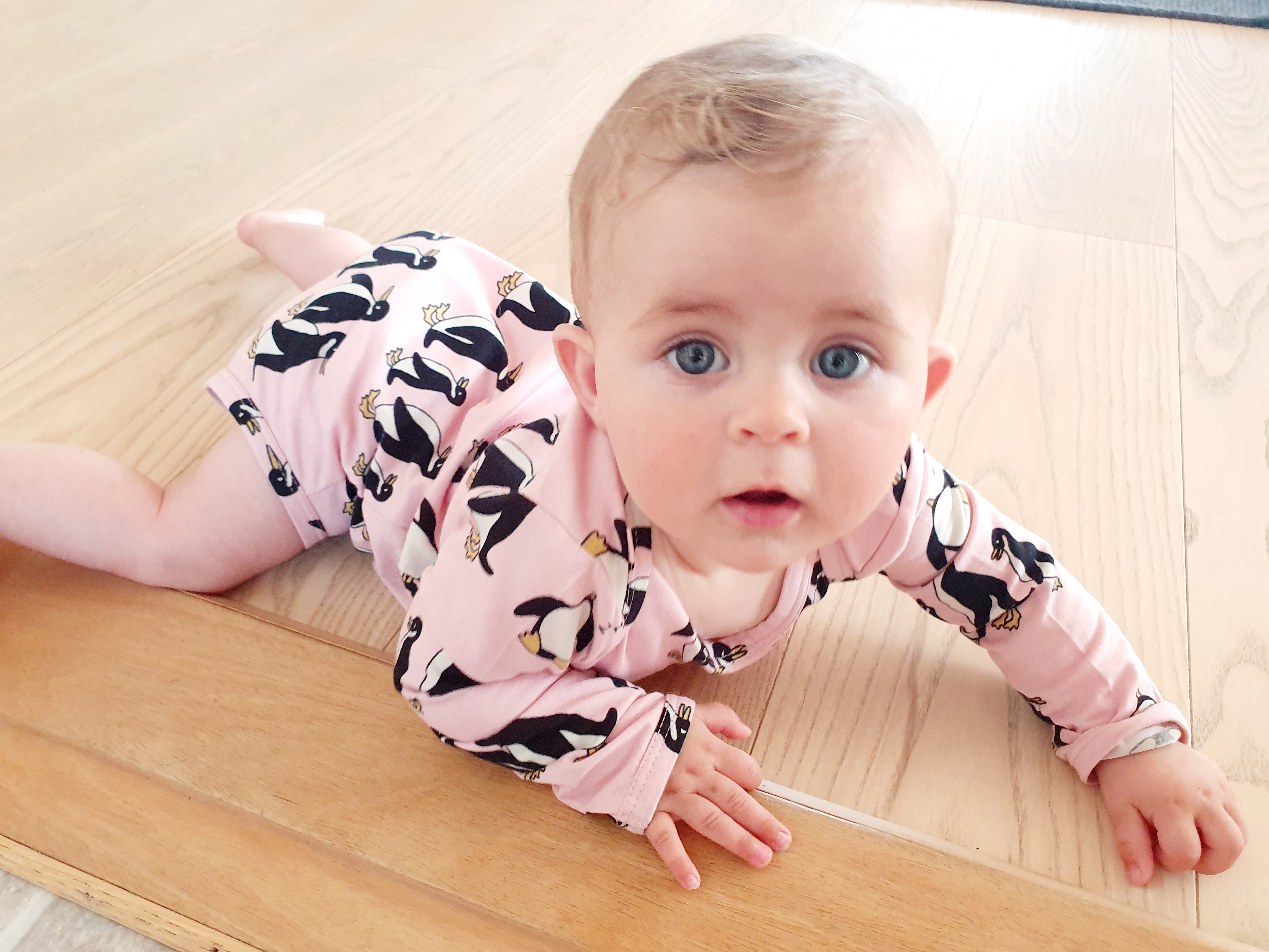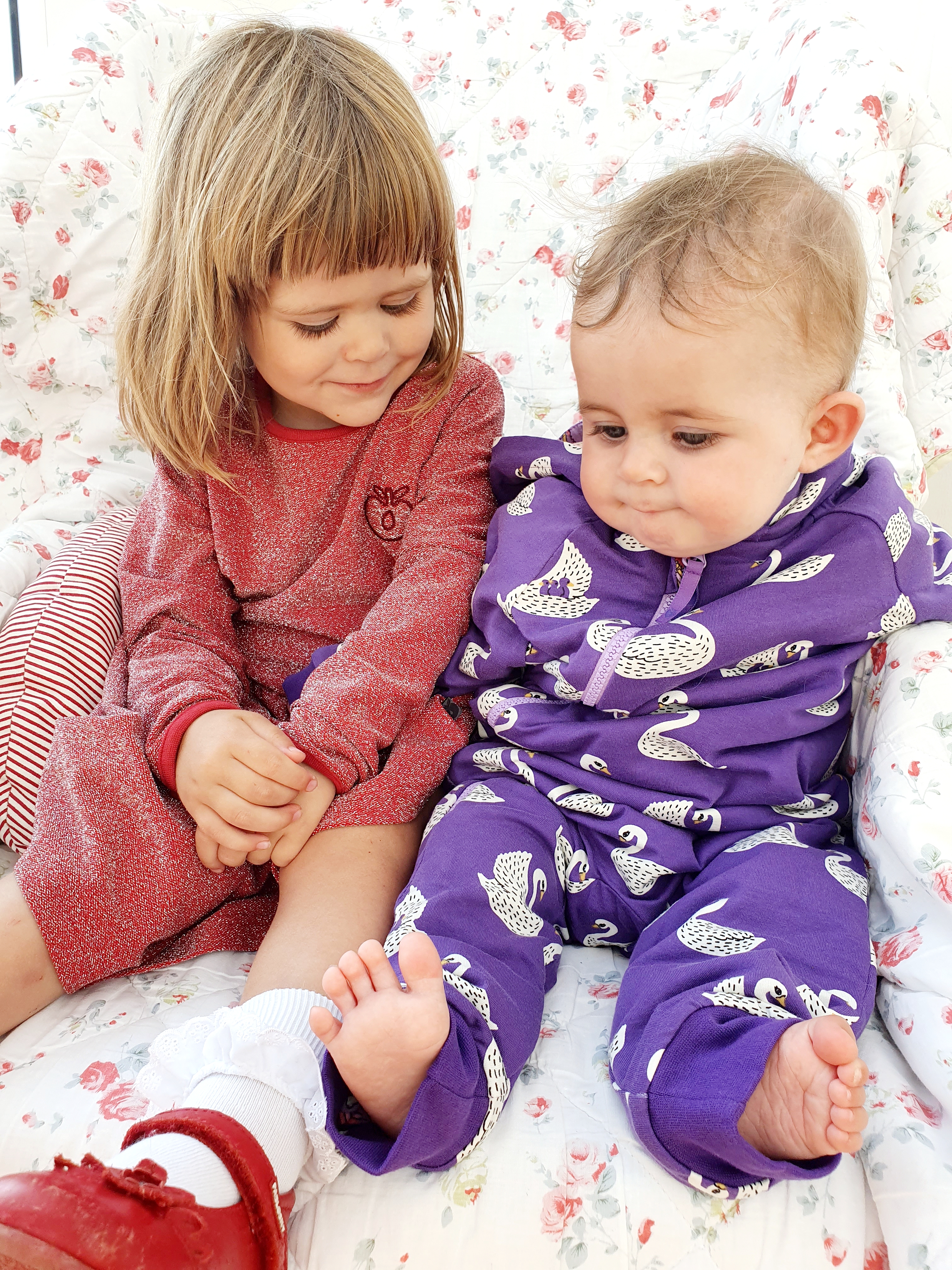 My 7 months old girl loves the turnable suit with hood. It is amazing for winter, really! The suit has landscape print on one side and swan print on the other. It has a smooth polyester padding and rib by the wrist and foot, and is made of 95% organic cotton and 5% elasthan.