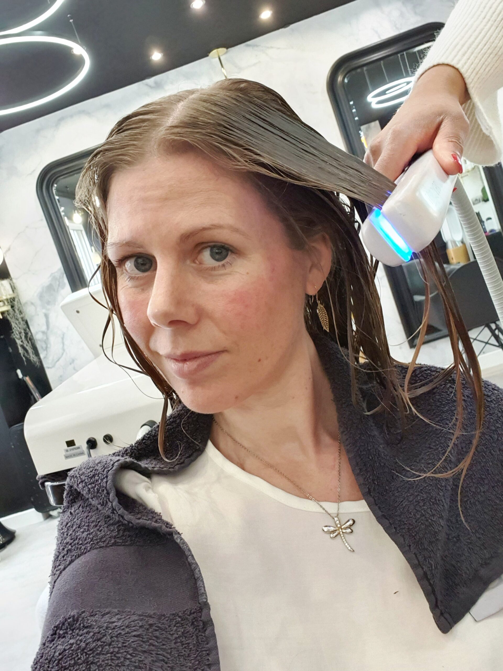 Then she wrapted my hair in cellophane for about 20 minutes and waited for the treatment to penetrate the hair…