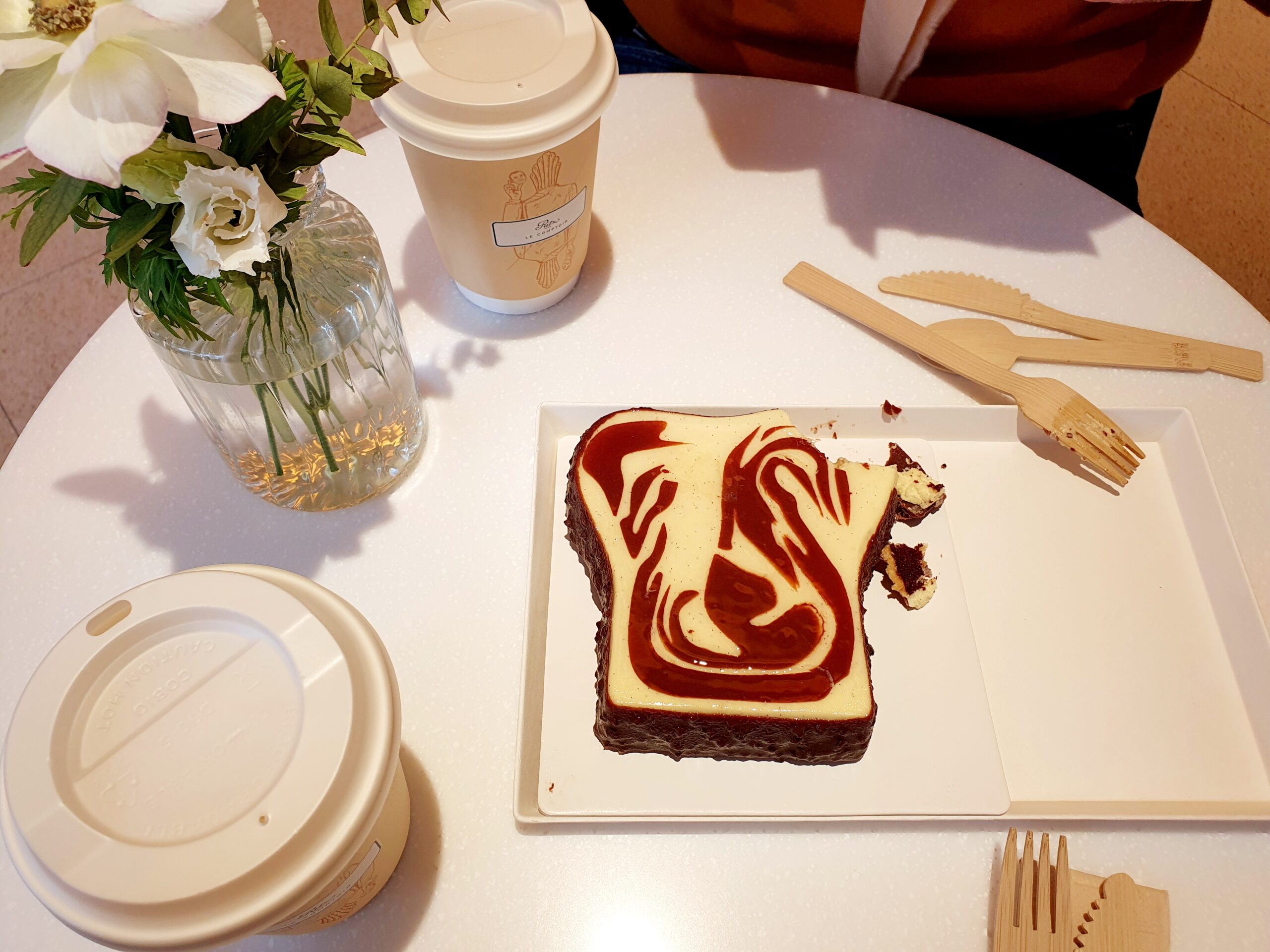 I tasted the Marble cake dessert with chocolate and caramel. It was delicious and so was the coffee.