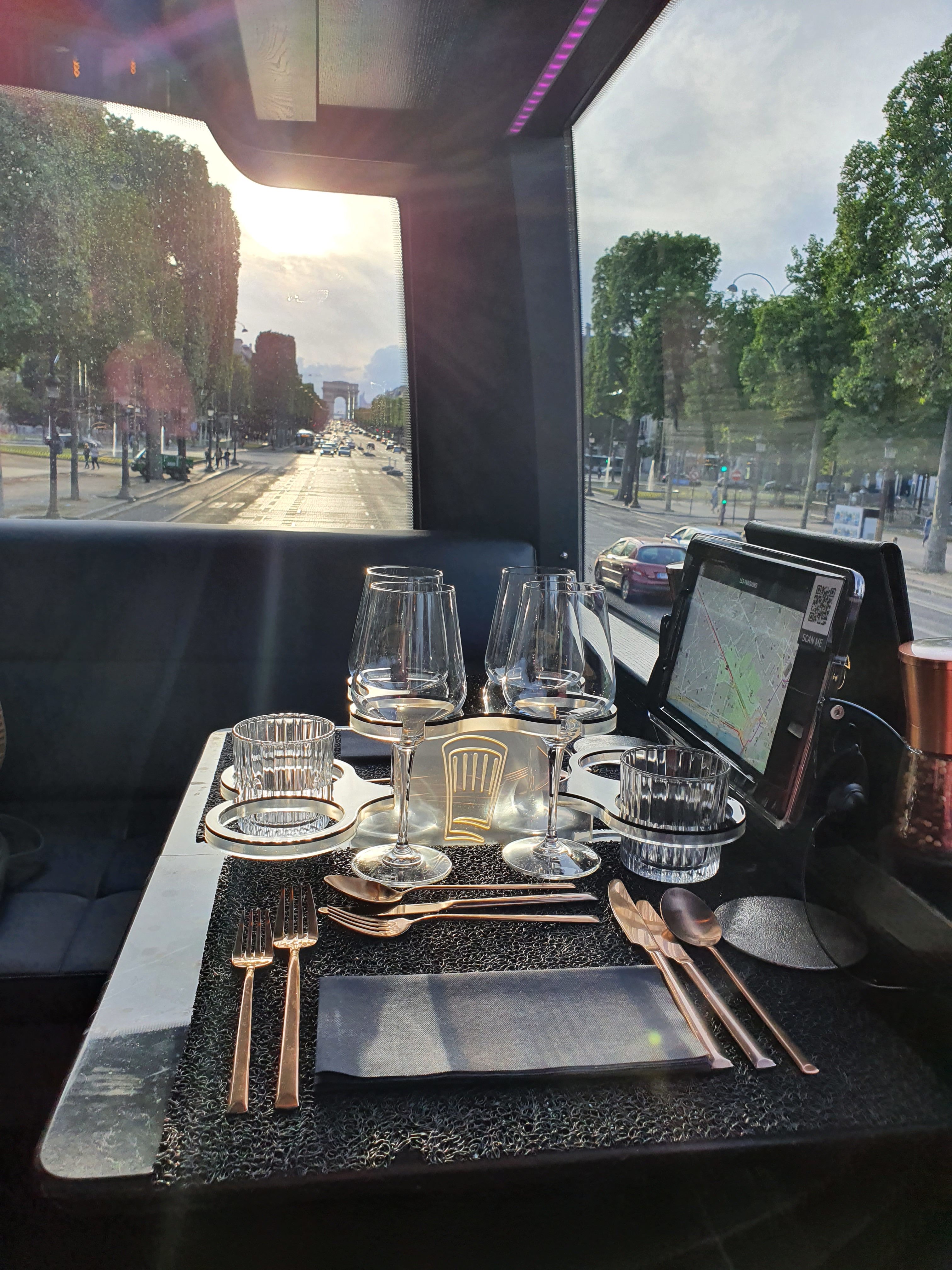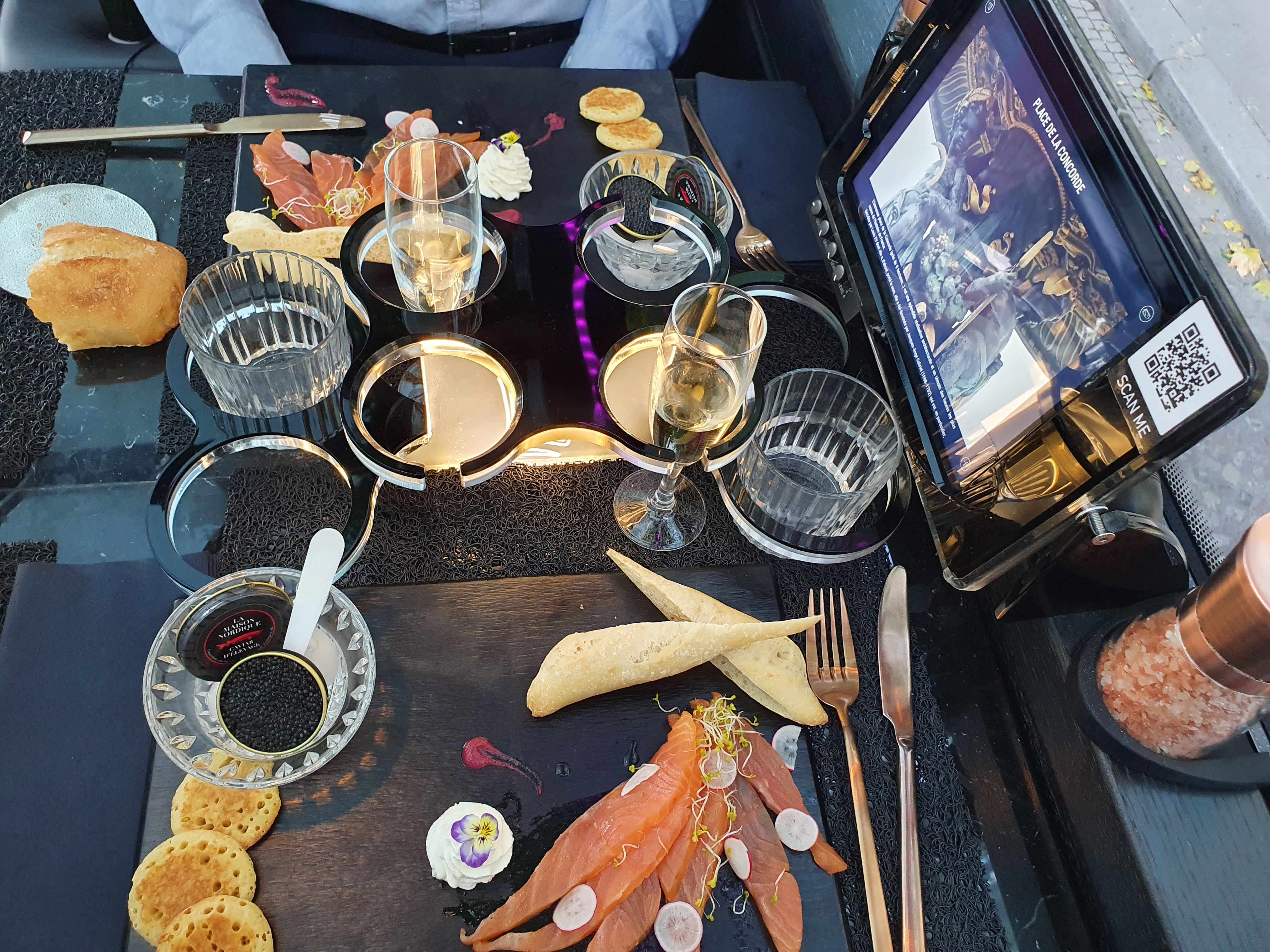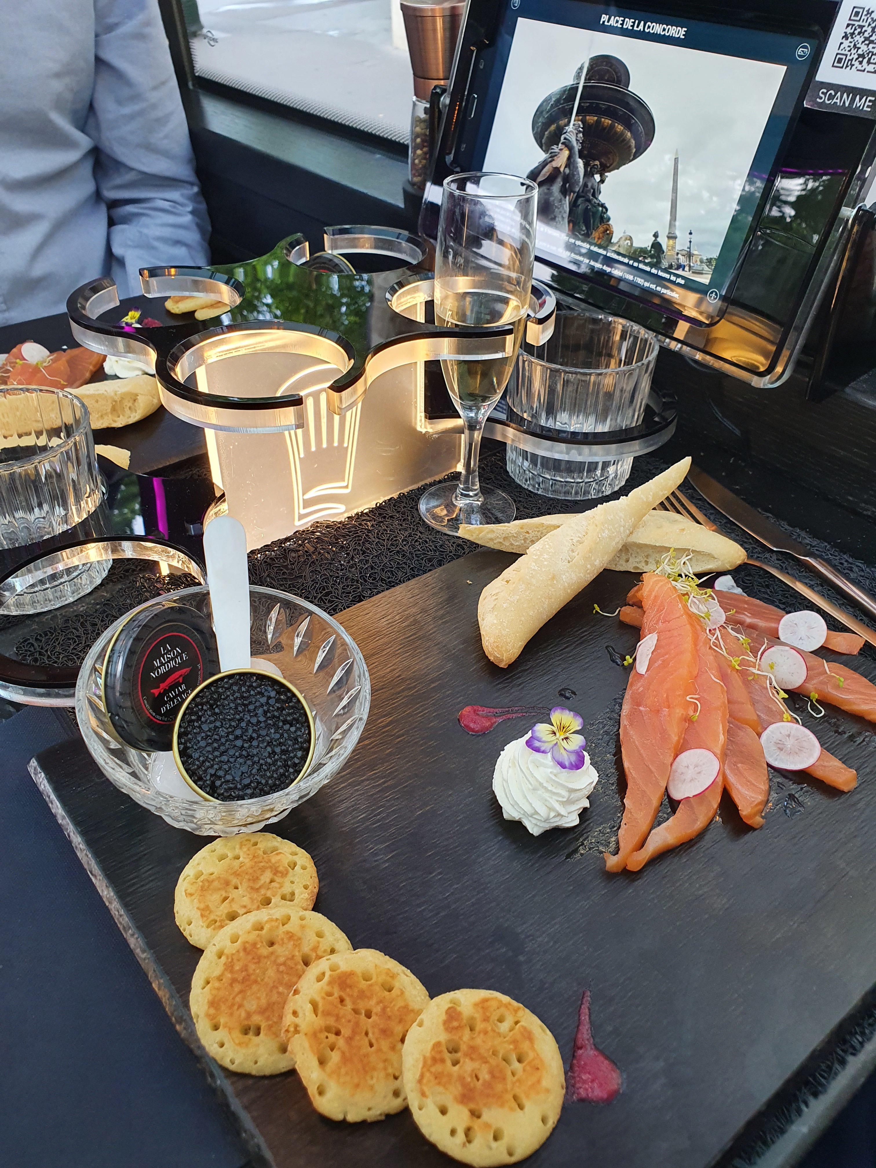 I choose the Paris by night departure with the new Parisian aperitif formula consisting of a plate of semi-smoked salmon and caviar, plus a glass of champagne.