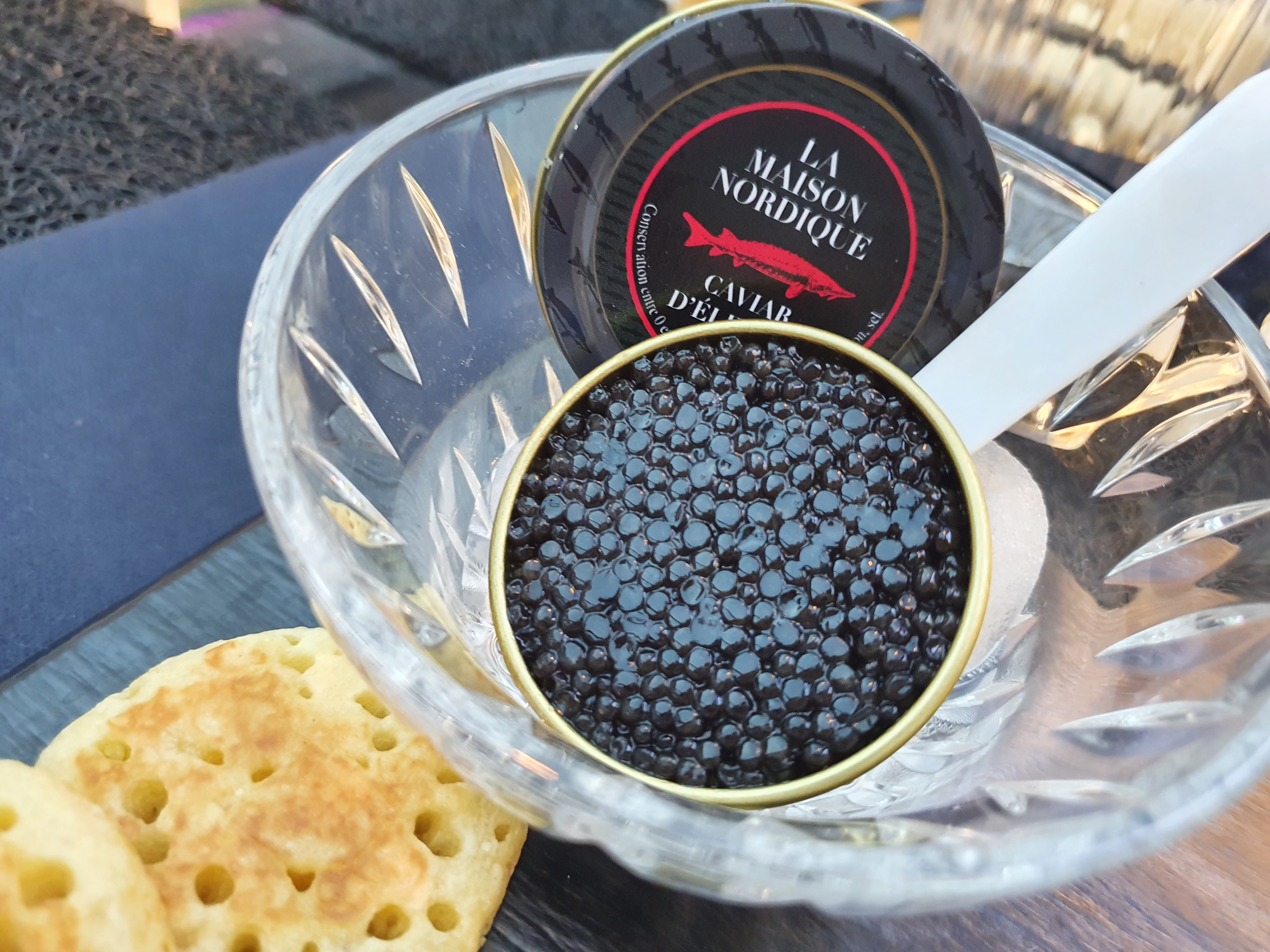 French caviar (15g) from the Nordic House with blinis and a heart of half smoked salmon breaded with dill, goat mousse with celery and gingerbread crumbs…