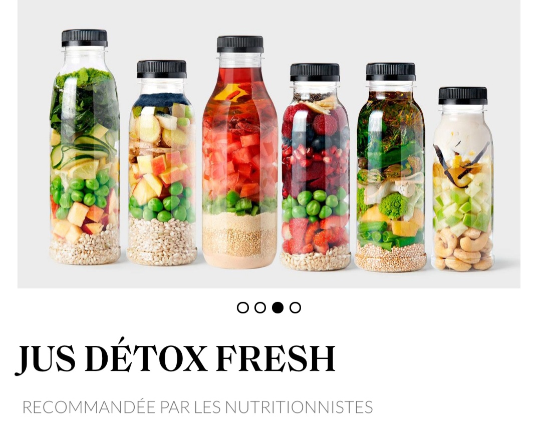 The 2-day cure of Fresh Detox Juice contain 12 juices made of: tomatoes, curcuma, ginger, spinach, quinoa, cuecumber, red pepper fruit, maïs, olive oil and you name it…