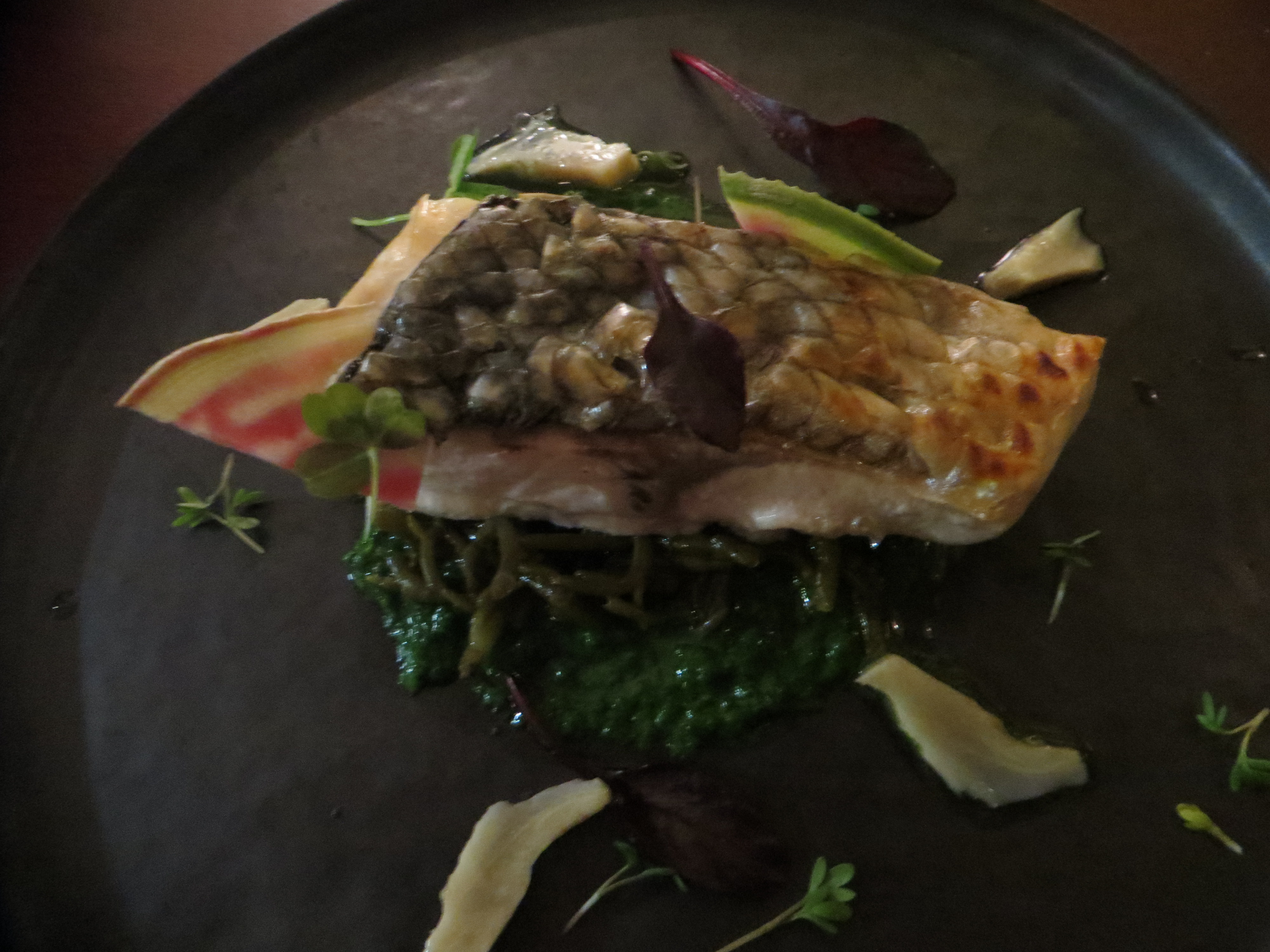 A bass with glasswort and lettuce juice…perfectly cooked.