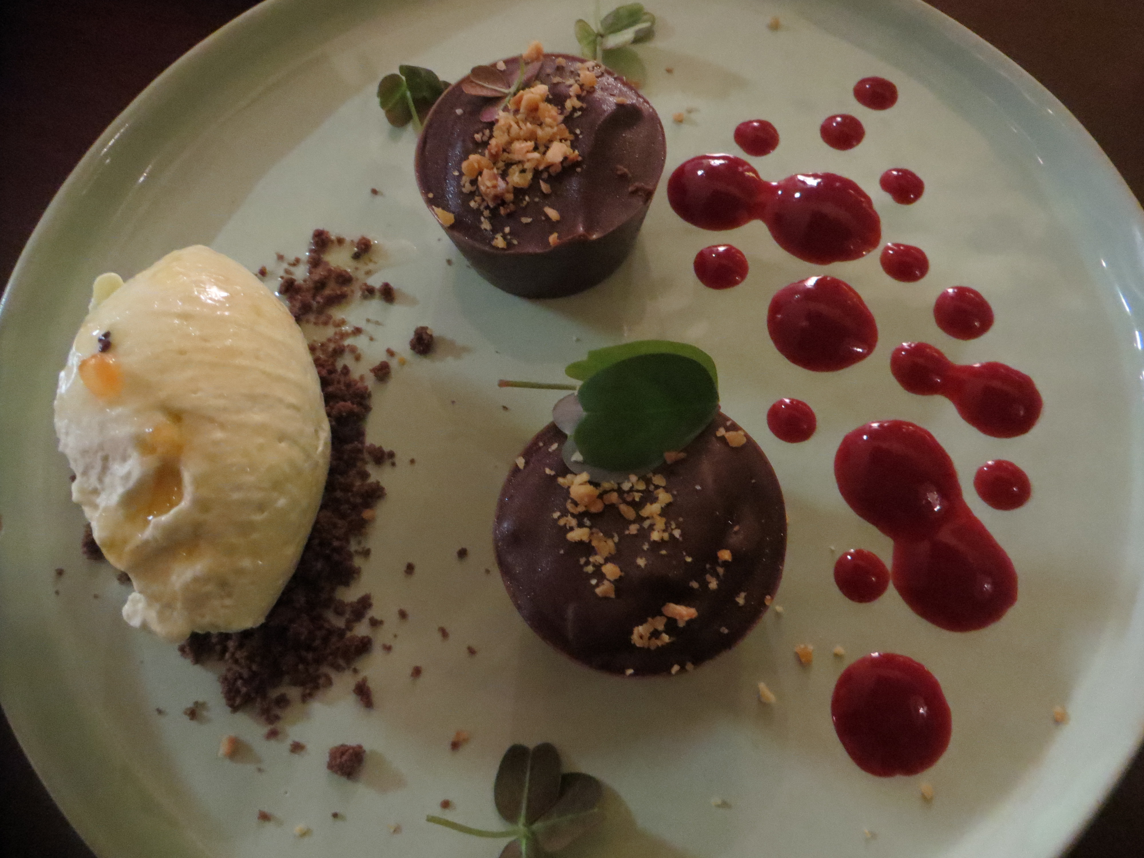 As a dessert I tried the dark chocolate dessert with raspberry sauce and a cream of passionfruit and avocado.