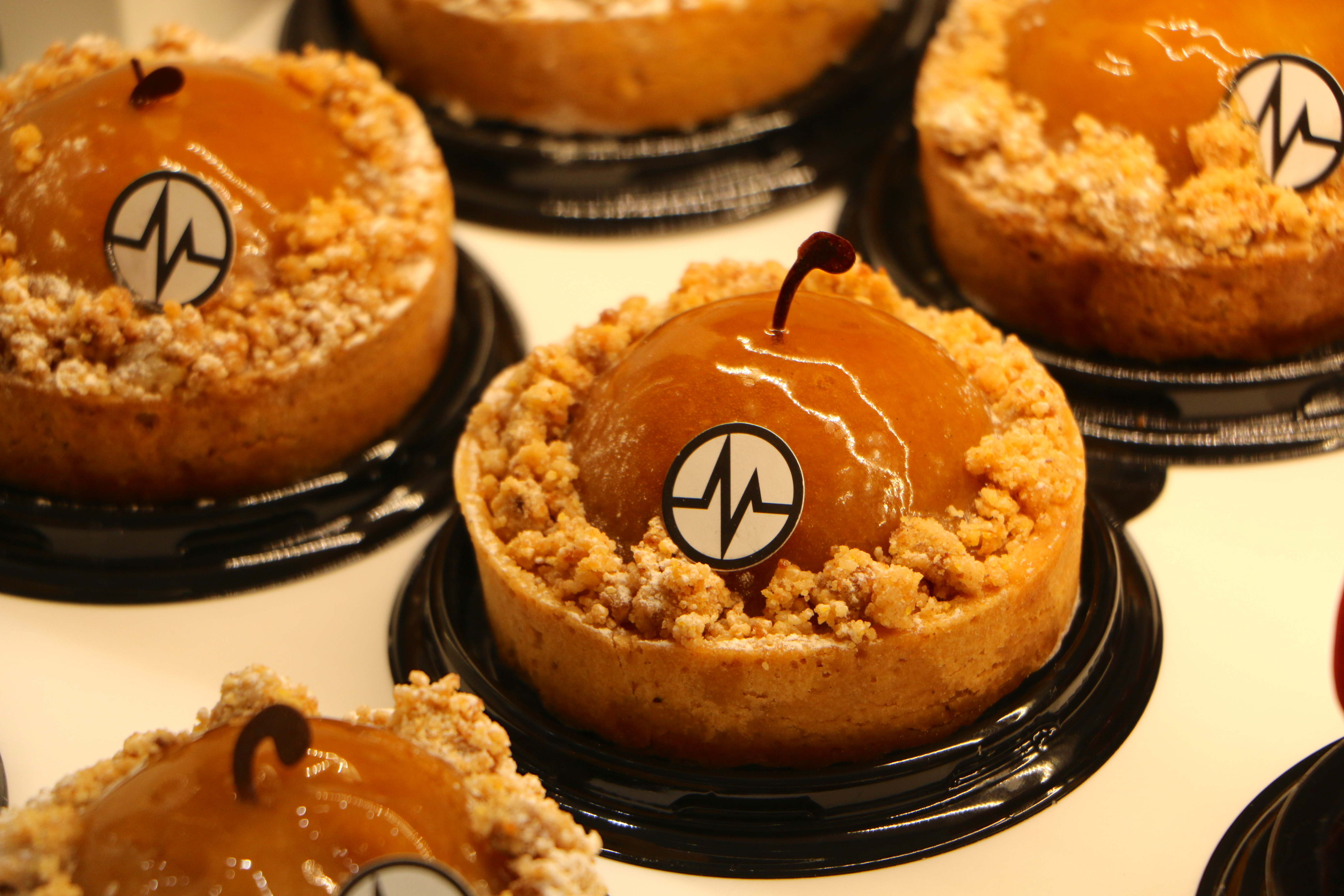 The “tarte pomme tatin” composed of a biscuit without wheat flour, punch, pastry cream with Calvados, apples cooked the “Tatin” way and crumble at 7,50€.