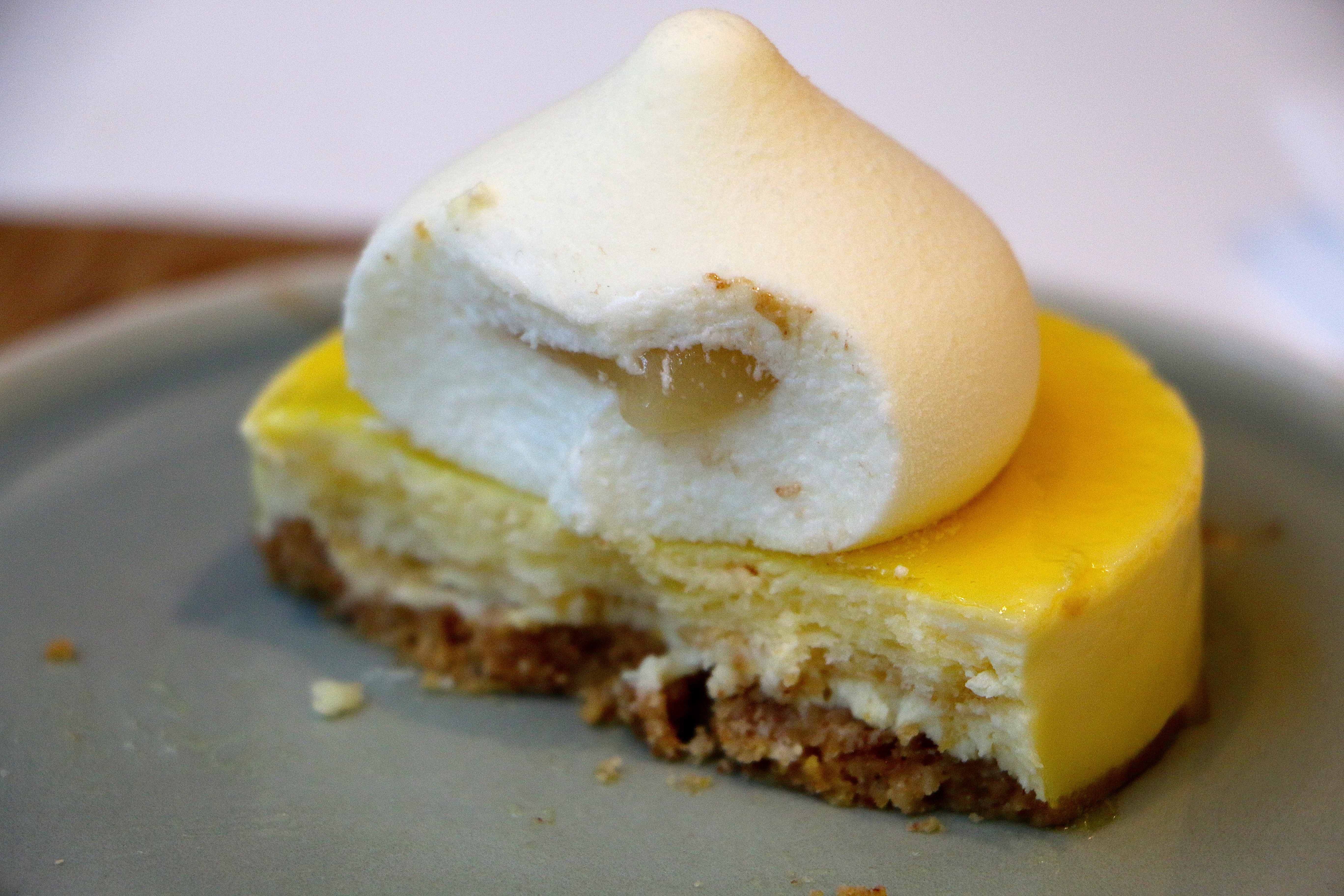 And the “Yuzu citron vert” without wheat flour, with Joconde biscuit without wheat flour, creamy yuzu, lime cream and meringue at 7,50€.
